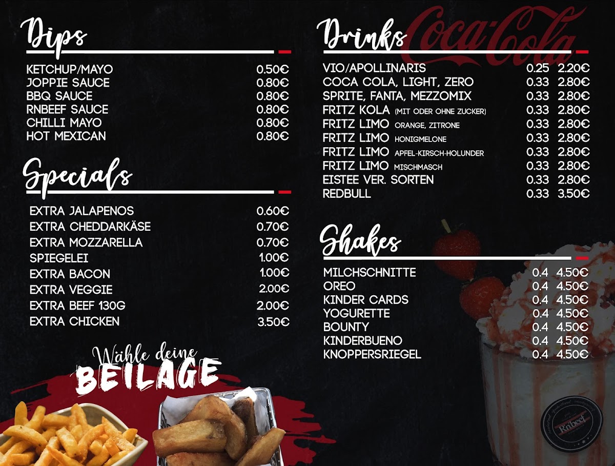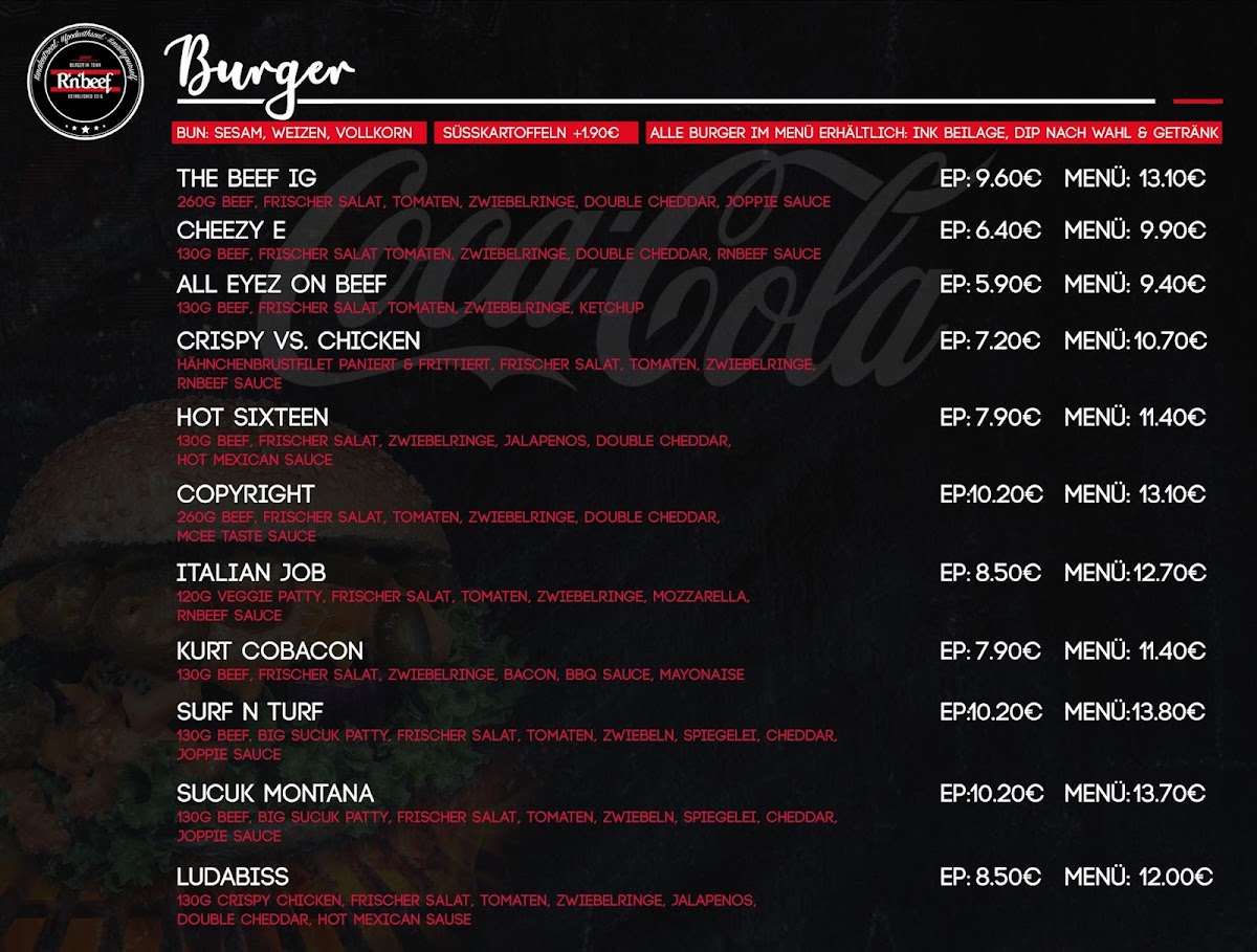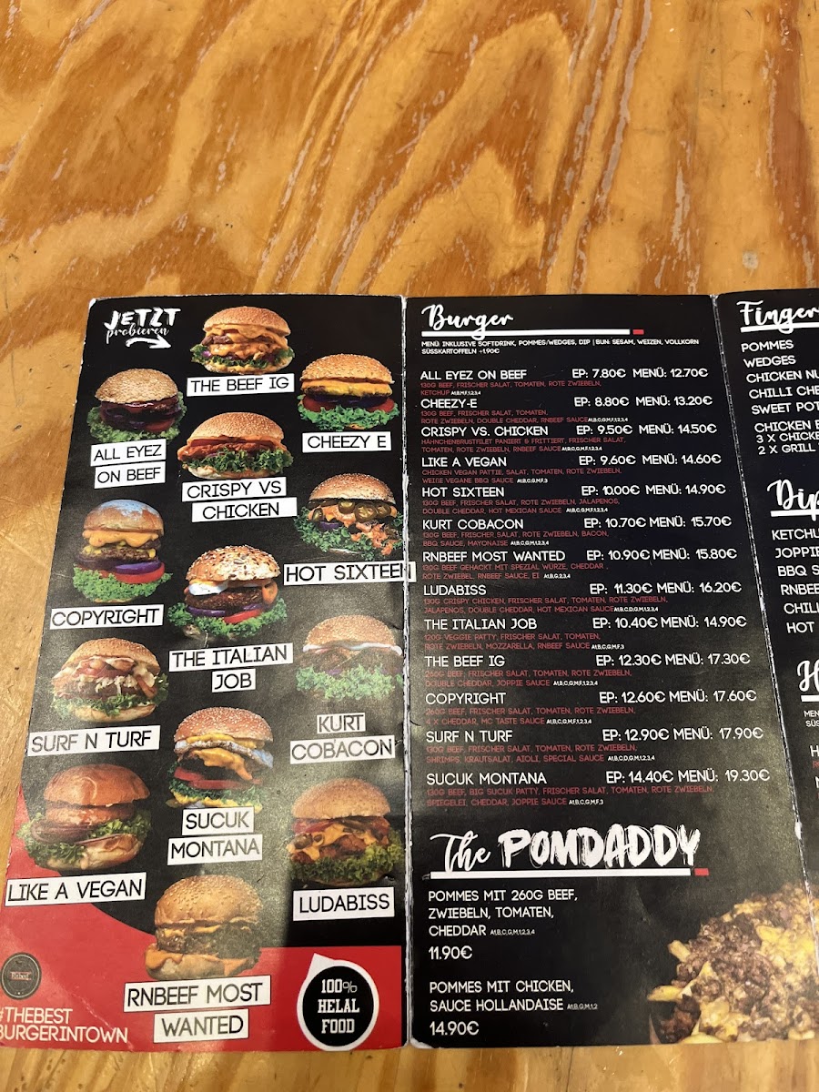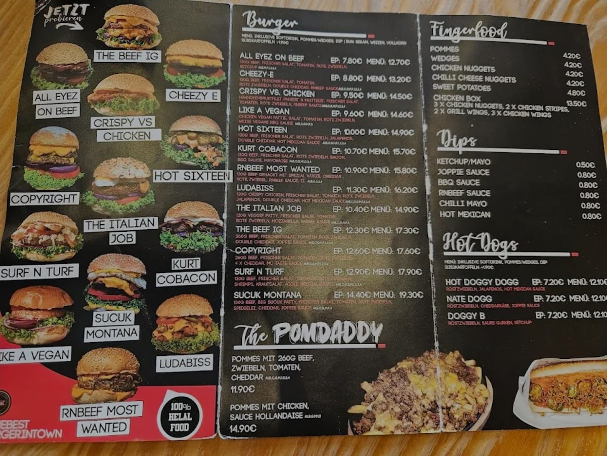RnBeef Düsseldorf serves a vibrant menu focused on juicy, flavorful hamburgers crafted with Halal ingredients. Highlights include signature dishes like the Hot Sixteen and the RnBeef Original, praised for their bold flavors and generous portions. The Cheezy and Kurt Cobacon sandwiches stand out, delivering a rich taste profile that satisfies hearty cravings. Complementing these are refreshing local drinks such as the well-loved Fritz Cola, enhancing the dining experience. The menu strikes a fine balance between fast food convenience and culinary quality, ideal for takeout or delivery. Friendly, attentive service paired with a lively atmosphere in Düsseldorf’s Bilk district makes each visit memorable. Above all, the menu showcases a fusion of authentic taste and halal assurance, inviting food lovers to savor every bite with confidence and delight.